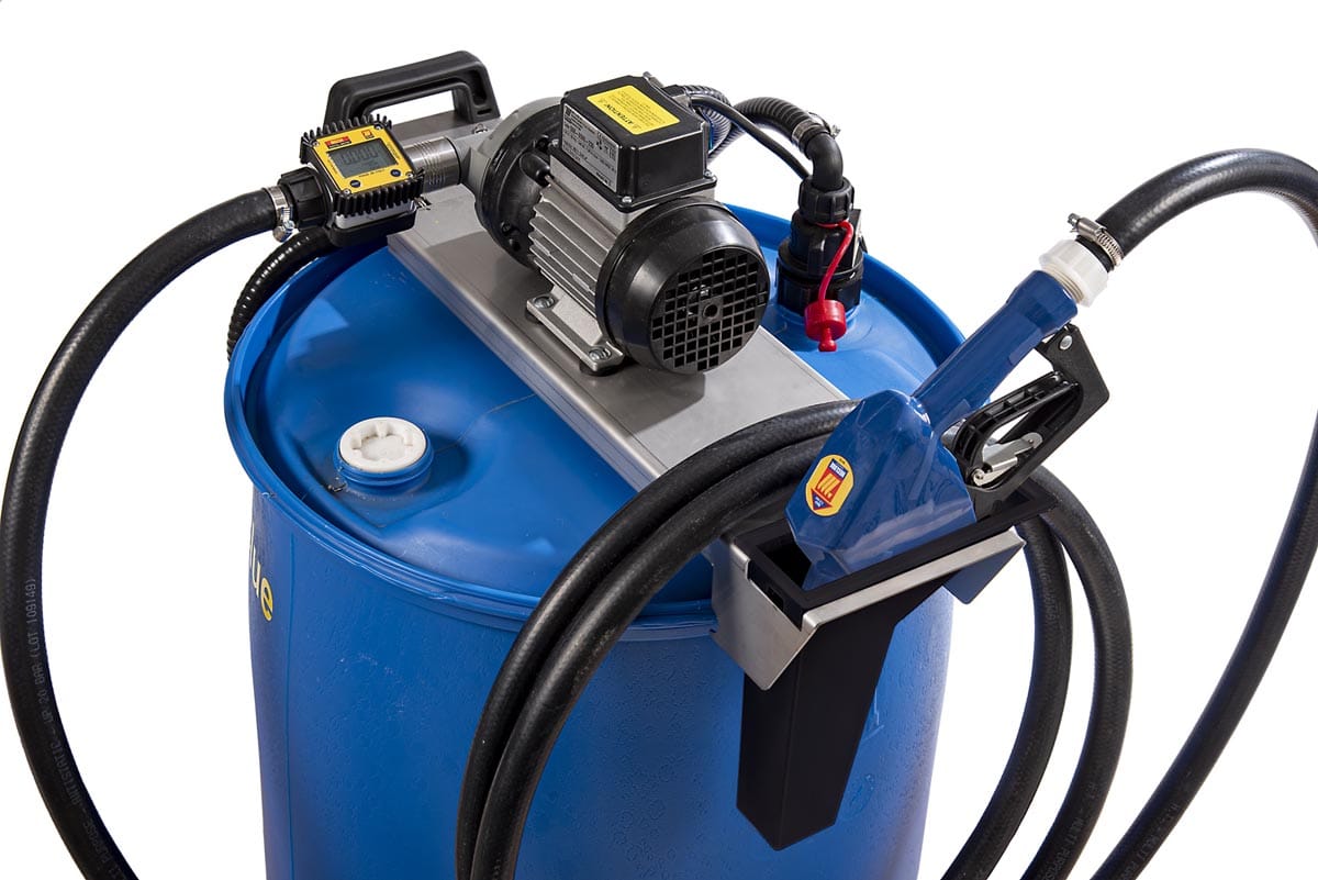 Kit AdBlue® adatto al travaso da fusti nei serbatoi dei veicoli. Composto da: staffa di supporto e fissaggio in acciaio inox per fusti , pompa elettrica autoadescante a membrana, contalitri digitale, pistola manuale o automatica, tubo EPDM lunghezza 6 m, e connessione di aspirazione.
