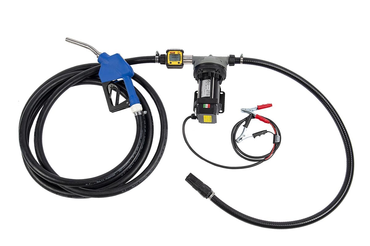 Kit AdBlue® adatto al travaso da fusti nei serbatoi dei veicoli. Composto da: Pompa elettrica autoadescante a membrana, contalitri digitale, pistola manuale o automatica, tubo EPDM lunghezza 6 m, tubo di aspirazione con valvola + filtro.